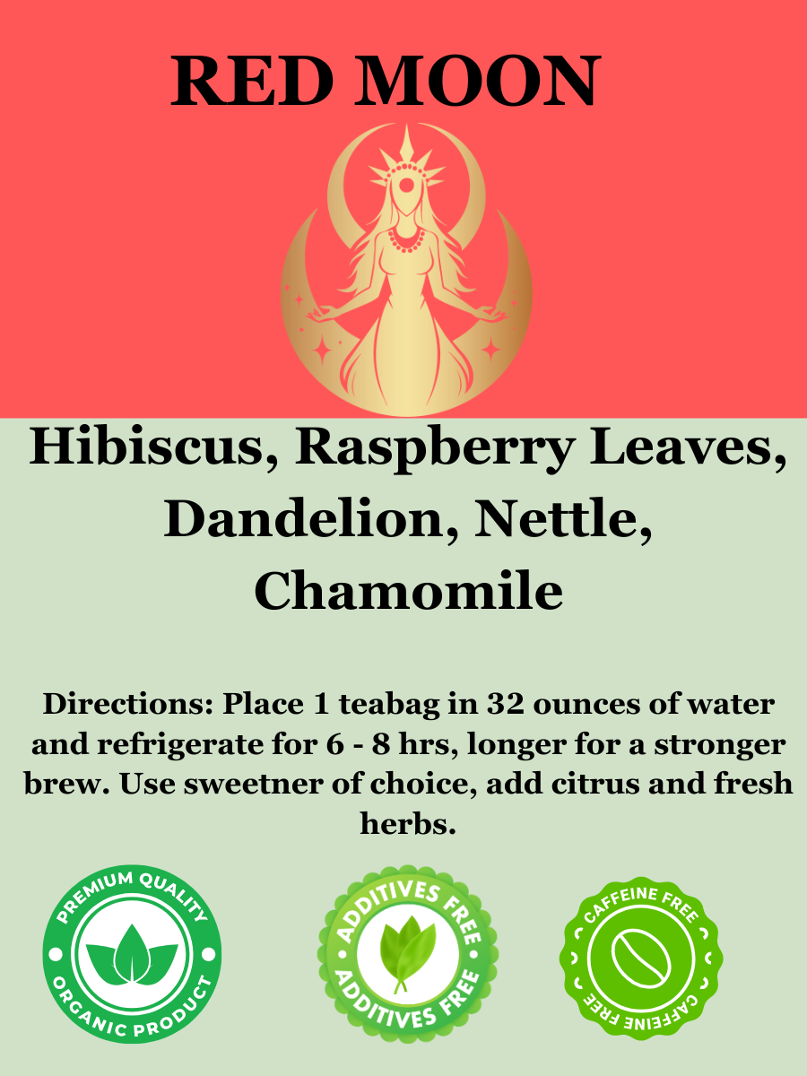 Hibiscus, Raspberry Leaves, Dandelion, Nettle and Chamomile.