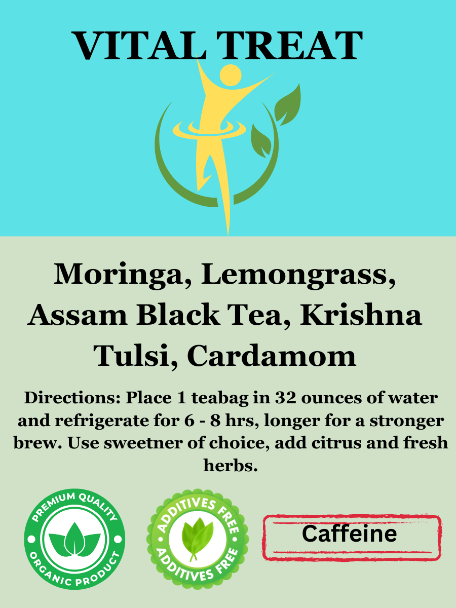 Organic Moringa, Organic Lemongrass, Organic Rama & Krishna Tulsi, Organic Cardamon pods.